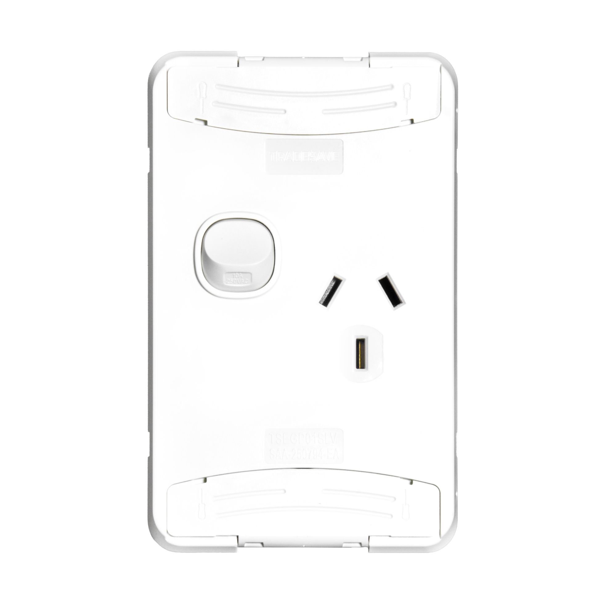 TRADESAVE Sleek 10A Single Vertical Power Point. Removable Cover Moulded in Flame Resistant Polycarbonate. Fade Resistant. Matt White