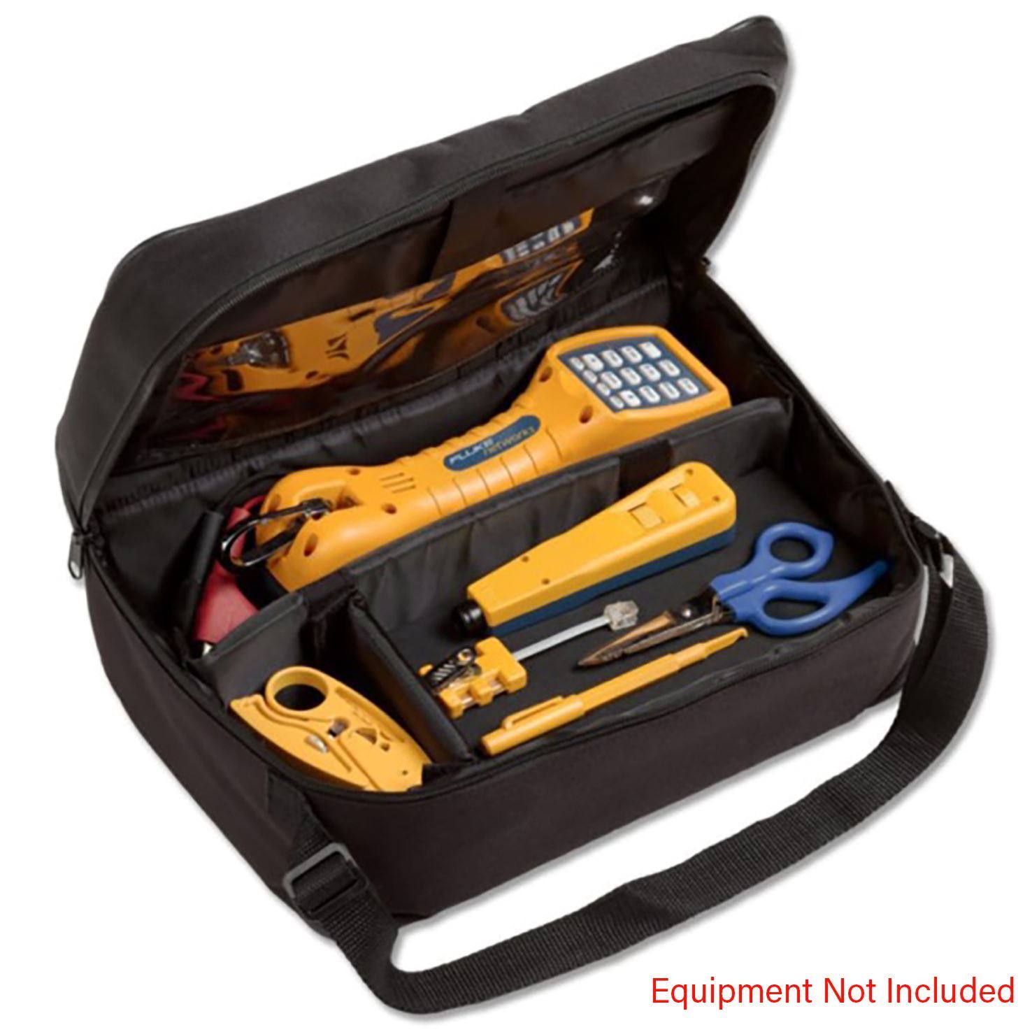 The Fluke Networks 11289400 Soft Case organizes commonly used telecom troubleshooting and installation equipment (sold separately) such as a TS30 Test Set, Pro3000 Analog Tone and Probe Kit, D814 Impact Tool, Cable Stripper, Standard 4-Wire Modular Adapter, Probe Pic and Electricians D-Snips Cable Scissors.