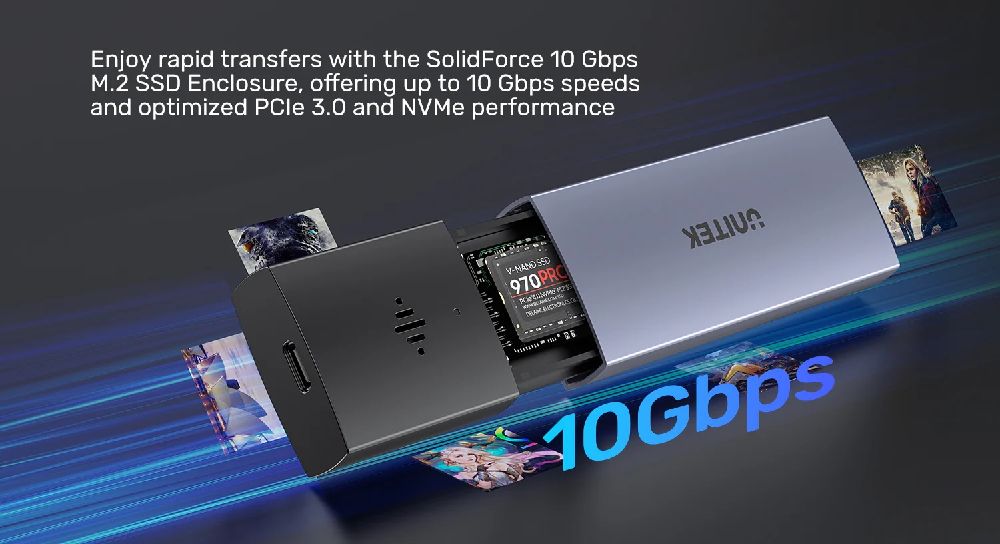 UNITEK SolidForce 10 Gbps Anti-Loss M.2 SSD Enclosure supports upstream transfer speeds of up to 10 Gbps and is compatible with 5 Gbps USB 2.0 transfer speeds. Additionally, it supports SSD TRIM and UASP acceleration, optimising read/write speeds for ultra-fast data transfers. It fully utilises PCIe 3.0 and NVMe SSD performance.