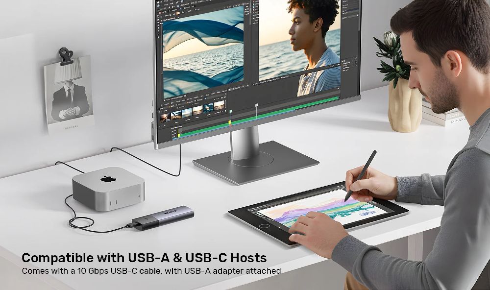 Including a 30cm 10Gbps USB-C to USB-C cable with USB-A adaptor. It offers unparalleled flexibility and great convenience for the end user to choose either USB-C or USB-A port to connect their personal devices for easy data transfer.