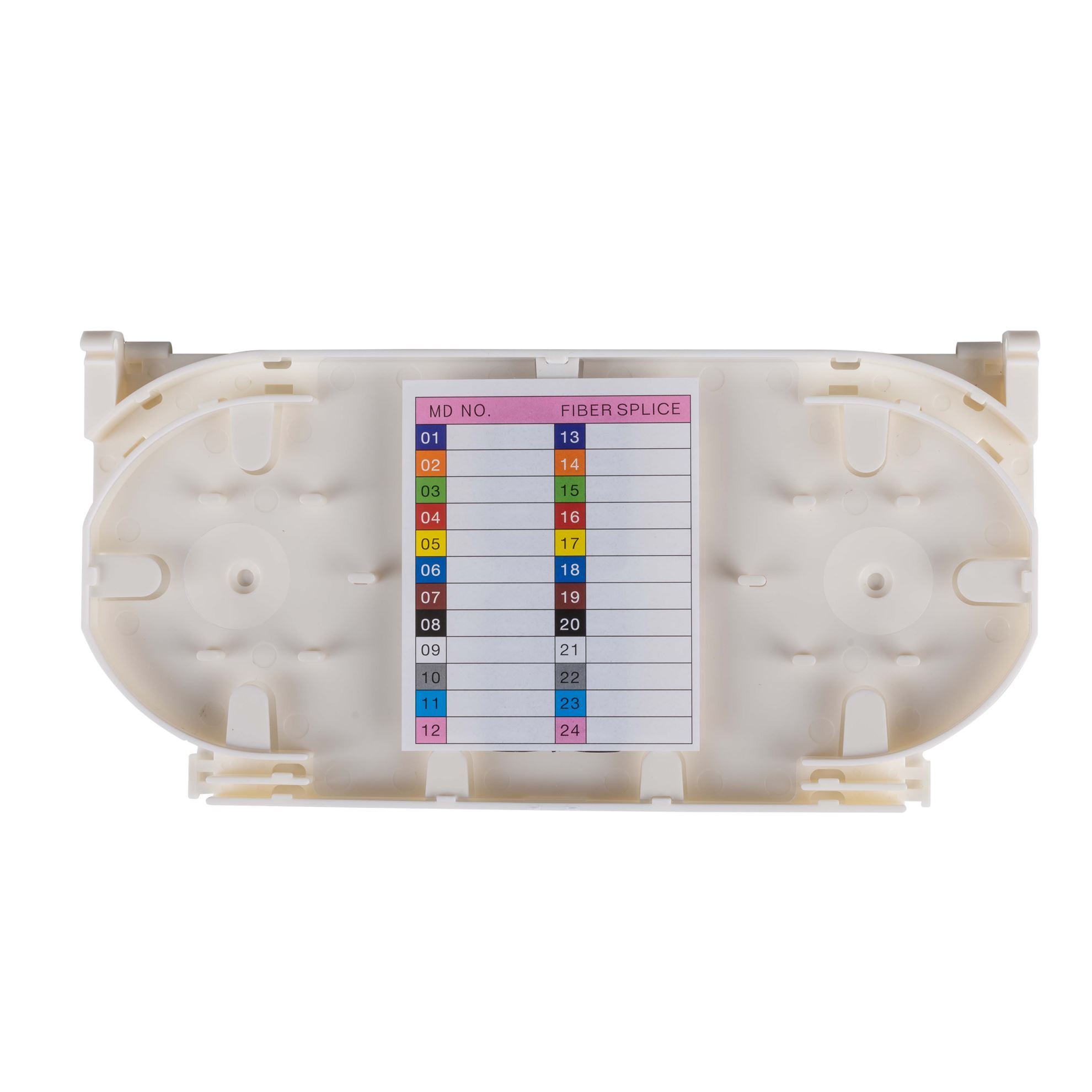 DYNAMIX splice tray is designed to splice 24 individual fibers which can be installed in rack mount patch panels, all mount enclosures, terminal box or distribution unit. The splice trays provide security for fusion splicing and can be used with different cable options. The splice tray is supplied with transparent cover to protect the splice and comes with a label on the top to write additional details.