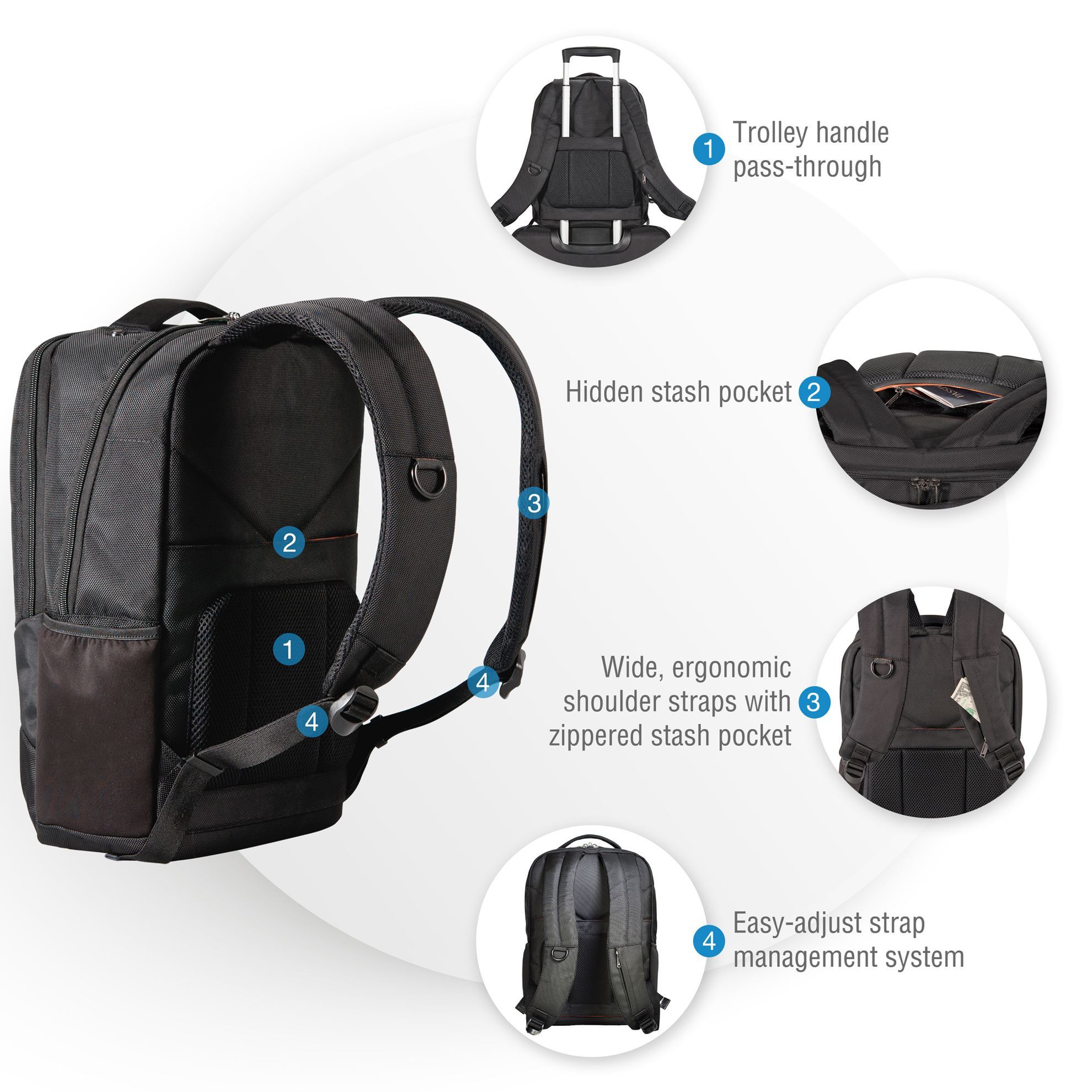 The lightweight Studio Laptop Backpack is smartly designed for today’s mobile manager or commuting professional. Its small frame efficiently carries daily essentials, like a 14.1-inch laptop or a MacBook Pro 15, as well as an iPad or tablet. And being organized is easy with the Studio, because all of the features are exactly where you’d expect them to be, along with some nice surprises too – like the stash pocket in the wide, ergonomic shoulder strap and the secret pocket hidden on the trolley handle pass-through. A pair of waist-level pockets keep water bottles close at hand; and you’ll also appreciate the pockets, pouches and slots for pens, business cards and phone. The Studio – understated organization.