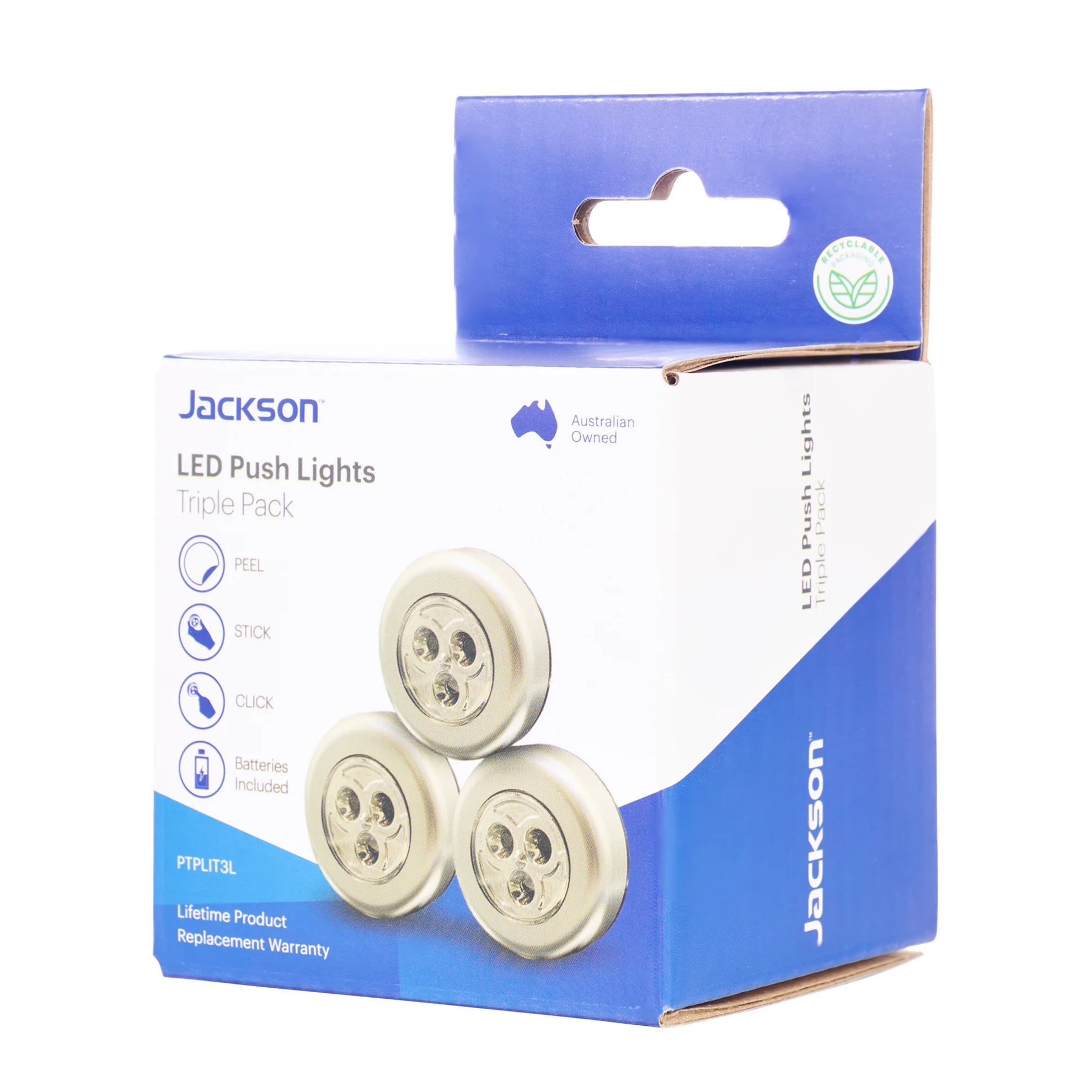 Home > Tools > Work Lights > Portable Work Lights > Triple Pack LED Push Light. 3 x AAA Batteries per Light Includes Peel & Stick