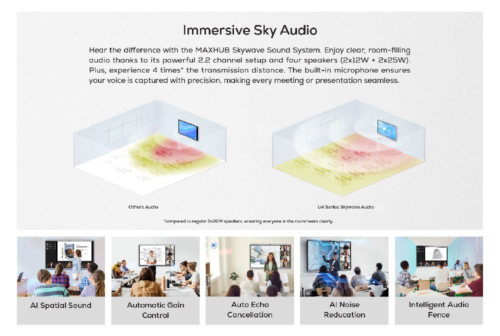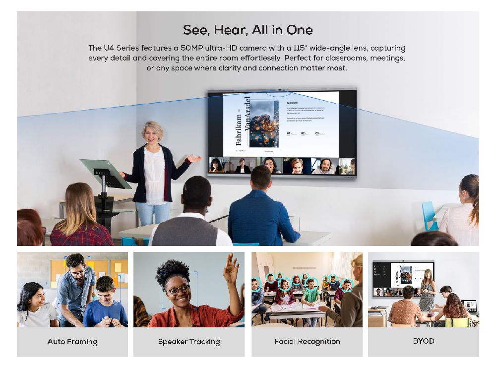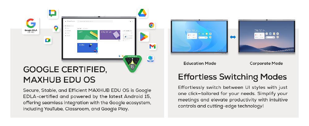 The MAXHUB U6540 is a versatile solution for both education and collaborative discussions. Equipped with a Google EDLA Certified operating system, it ensures seamless integration with Google apps and accounts, while the AI-powered SoC ensures smooth performance. The advanced touchscreen enables precise writing, and the powerful AI camera and microphone deliver clear audio and video for seamless interactions. With versatile connectivity options, it simplifies content sharing and enhances collaboration, making it an ideal tool for productive and engaging communication.