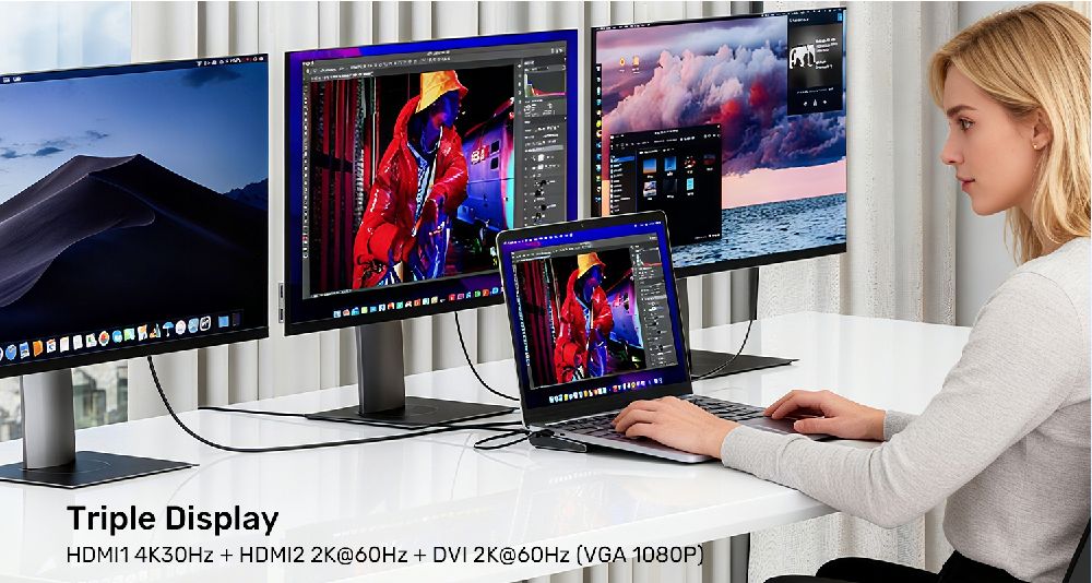 Boost your productivity with triple display outputs! Enjoy stunning visuals with a single display supporting up to 4K@30Hz via HDMI. When triple monitors are connected, it supports maximum resolution of 1 x HDMI at 4K@30Hz, 1 x HDMI at 2K@60Hz, and 1 x DVI at 2K@60Hz. The included DVI to VGA adapter makes connecting to older monitors easy, delivering clear 1080p @ 60Hz.