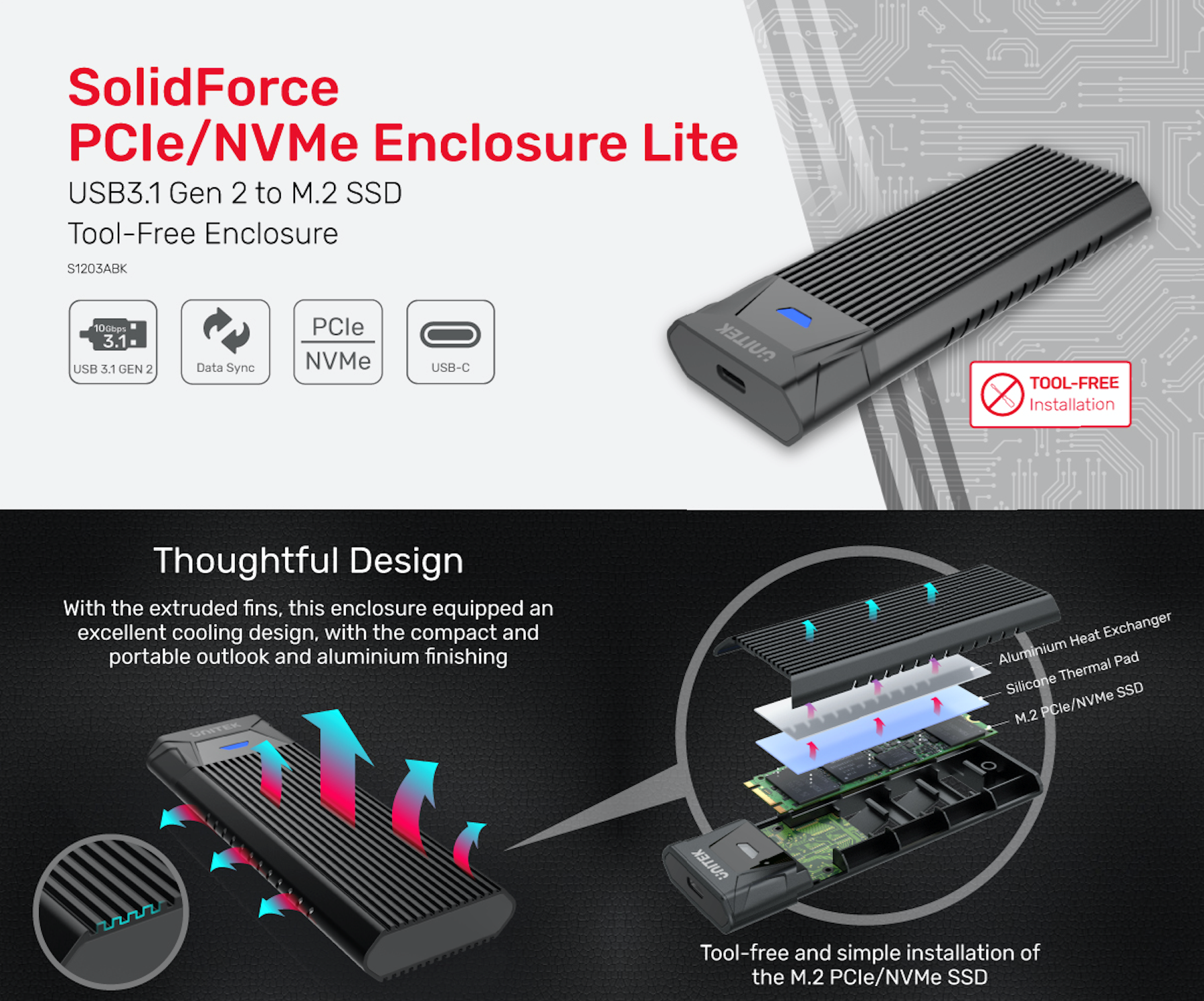 USB 3.1 Gen2 to M.2 SSD Tool-Free (PCIe/NVMe) Enclosur SuperSpeed 10Gbps Data Trans