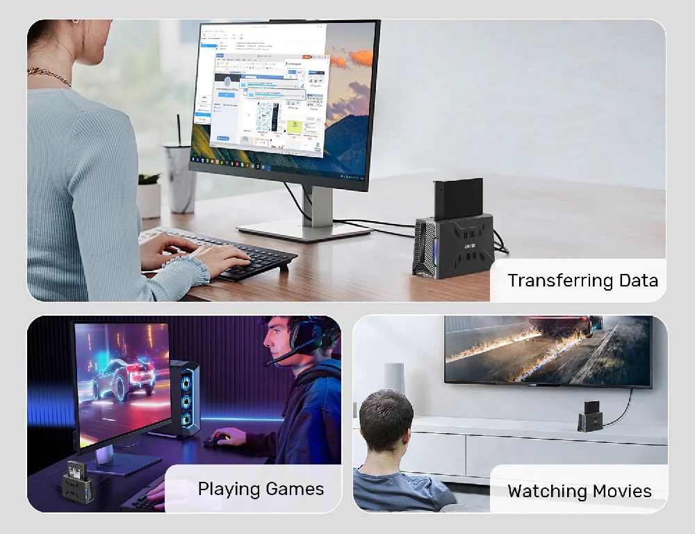 Combines a modern, compact design with practical functionality, seamlessly fitting into any workspace. It supports efficient data transfers for 2.5”/3.5” SATA SSDs/HDDs and M.2 PCIe SSDs, making it perfect for managing large files, gaming, or media playback. With its stylish look and reliable performance, it enhances both productivity and aesthetics on your desk.