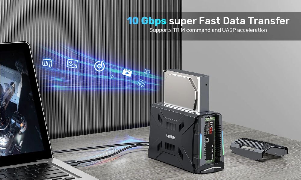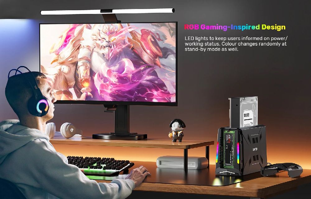 Supporting a range of activities, including transferring data with ease, playing games with high-speed access to 2.5”/3.5” SATA SSDs/HDDs and M.2 PCIe SSDs, and watching movies with reliable performance. Its dual-drive mode and 10Gbps speed, paired with intelligent cooling and RGB LED lights, make it a versatile solution for work and leisure.